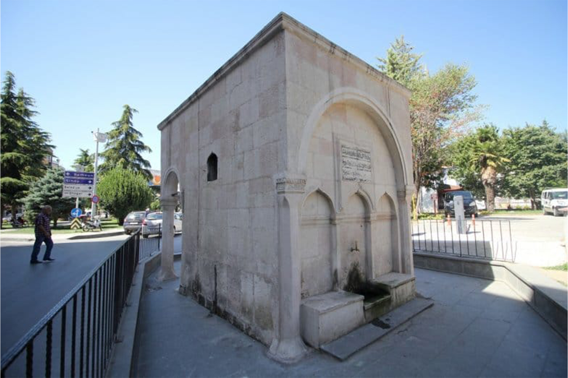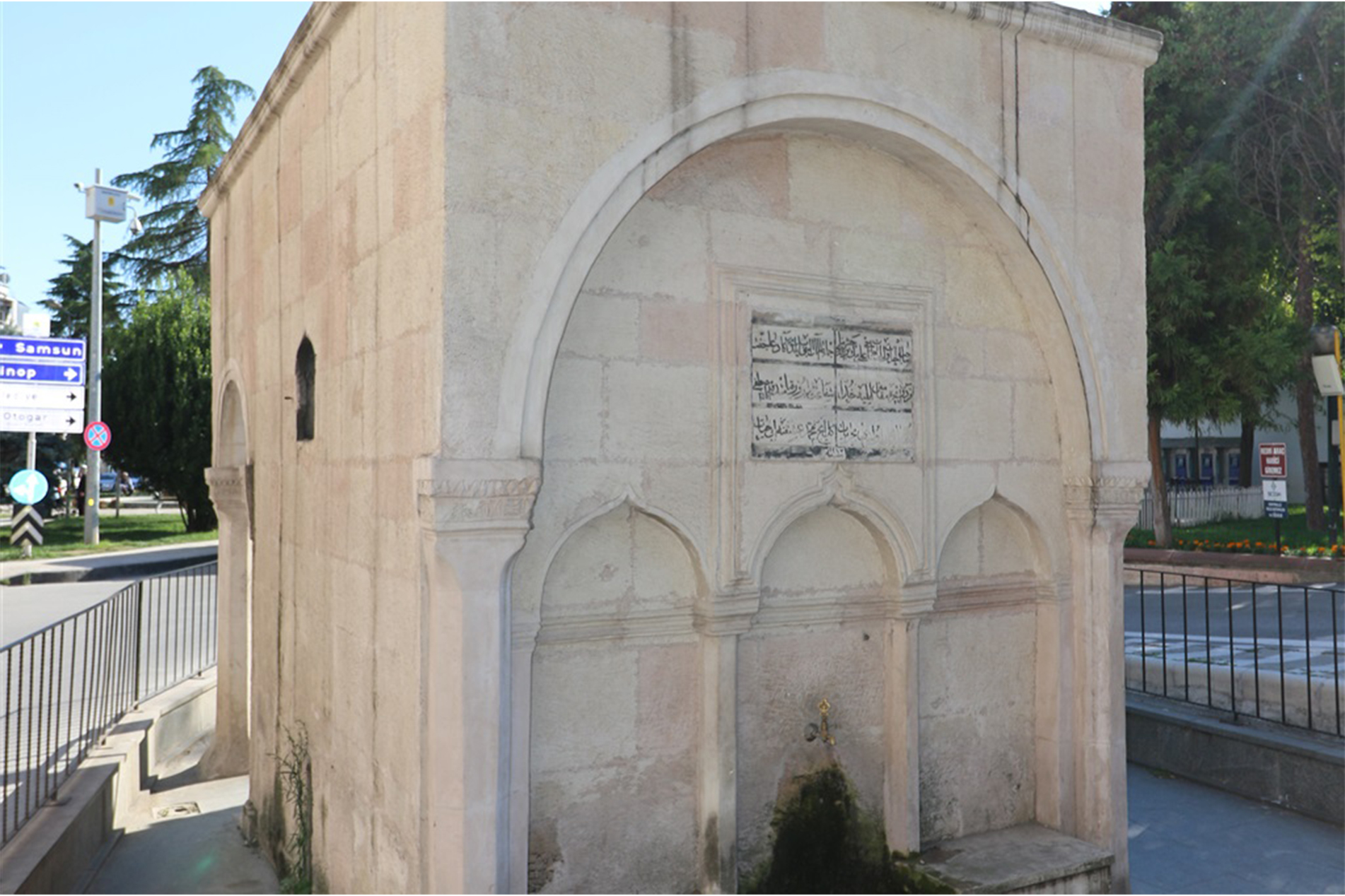 Cumhuriyet Mahallesi'nde 39 ada, 6 parselde yer alan çeşme 1751 yılına tarihlendirilmesi sebebiyle Geç Osmanlı Dönemine ait olan bir meydan çeşmesidir. Cadde üzerinde bulunan yapı düzgün kesme taştan yapılmıştır. Ön cephesi önde iki sütun, arkada iki yarım sütunla taşınan yuvarlak kemerlidir. Sütun başlıkları zikzak motiflerle süslüdür. Duvarda işlemeli bir çerçeve içinde 8 satırlık bir kitabe olup ortadan dikine çizgiyle ikiye ayrılmıştır. Ortadaki kemerin üzerinde dikine bir çizgi ile ikiye ayrılan 3 satırlık bir kitabe yer almaktadır. Çeşmenin üst kısmı düzdür. 08.03.1984'te tarihi olarak tescillenmiştir.
