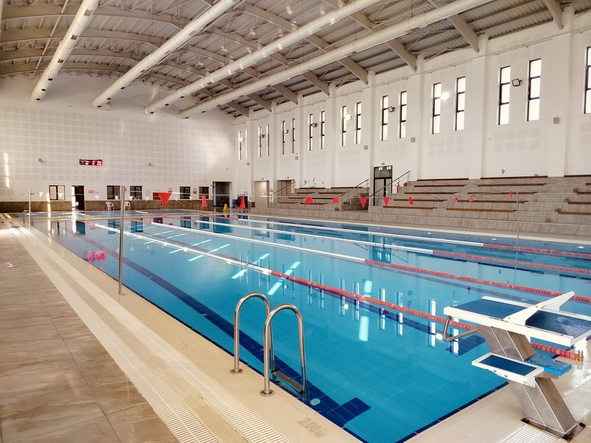 Tesisimiz, modern altyapısı ve yüksek güvenlik standartlarıyla hizmet veren kapalı yüzme havuzu bölümüyle ziyaretçilerine dört mevsim kesintisiz kullanım imkânı sunmaktadır. Tesiste 1 adet yarı olimpik yüzme havuzu, 1 adet üç kademeli eğitim havuzu ve spor amaçlı faaliyetlere uygun 2 adet çok amaçlı salon bulunmaktadır. Yarı olimpik yüzme havuzu, profesyonel antrenmanlar ile bireysel yüzme çalışmalarına uygun ölçülerde tasarlanmış olup su sıcaklığı, hijyen seviyesi ve filtrasyon sistemi düzenli olarak kontrol edilmektedir. Havuz, hem sporcuların performans gelişimini destekleyecek şekilde hem de ziyaretçilerin güvenli bir ortamda yüzme deneyimi yaşayabilmesi için ulusal standartlara uygun biçimde işletilmektedir. Üç kademeli eğitim havuzu ise çocuklar, başlangıç seviyesi yüzücüler ve teknik geliştirme programlarına katılan bireyler için özel olarak düzenlenmiştir. Farklı derinlik seçenekleri sayesinde tüm yaş gruplarında güvenli öğrenme ortamı sağlamaktadır. Tesis bünyesinde bulunan iki çok amaçlı salon ise su sporlarını destekleyici kara antrenmanları, grup dersleri ve çeşitli sportif etkinliklere uygun olarak kullanılmaktadır. Kapalı yüzme havuzu bölümü, hijyen, erişilebilirlik ve güvenlik öncelik alınarak yönetilmekte tüm ziyaretçilere sağlıklı, konforlu ve düzenli bir spor ortamı sunmayı amaçlamaktadır.