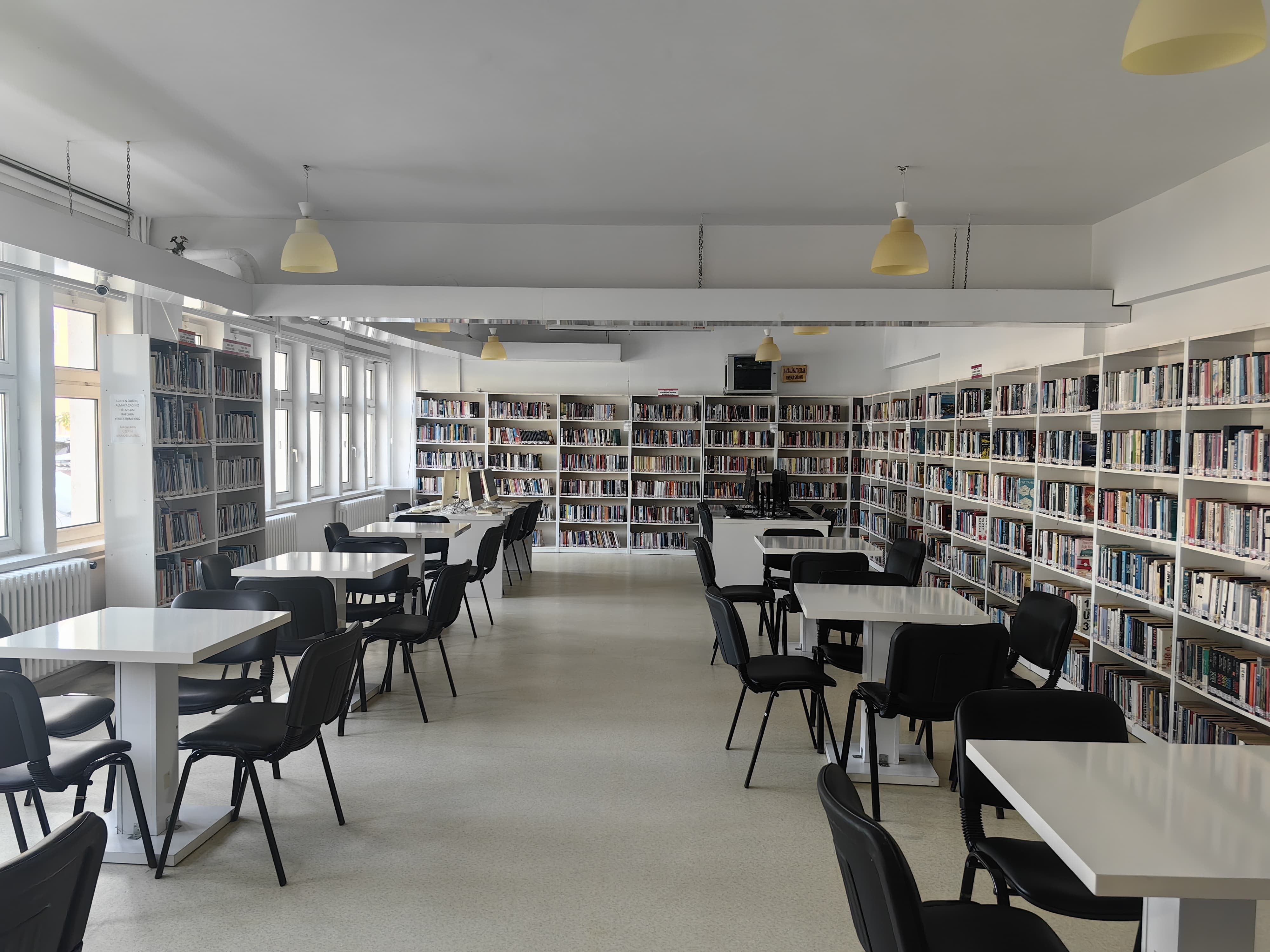 Bağımsız binasında hizmet veren kütüphanemizde 20.000'e yakın çeşitli alanlarda kitaplar, küçük grupları ağırlayabilecek etkinlik masaları ve görevli 2 personeli bulunmaktadır.