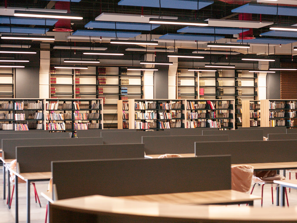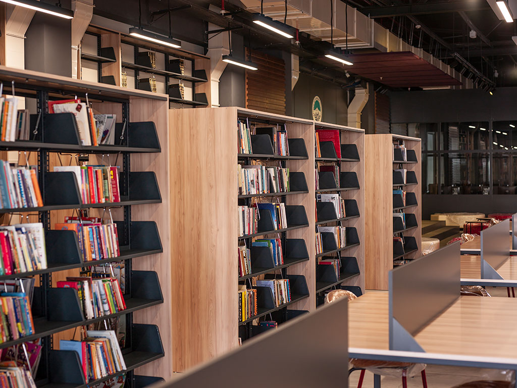 Kütüphanemizde 12. 000 basılı kitap, 18.000 e- kitap, 3.000 sesli kitap bulunmaktadır. Ayrıca dünya basınını takip edebileceğimiz veri tabanımız mevcuttur. Kütüphanemiz dinlenme bölümü, satranç köşesi, sesli çalışma odası, ferah ders çalışma salonları, şifreli emanet dolapları, mini tv- sinema izleme bölümü, bay- bayan mescitler, eğlenceli okuma ünitesi ve ayrıca çocuk kütüphanesinden oluşmaktadır.
