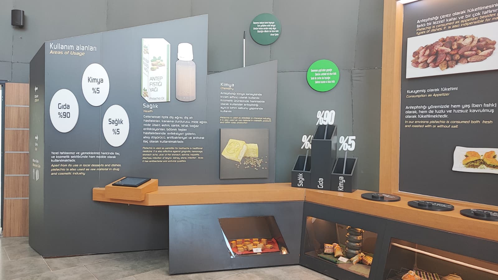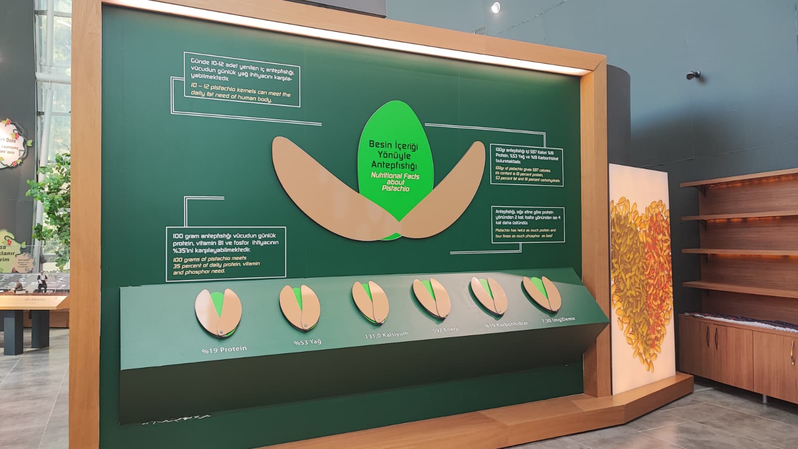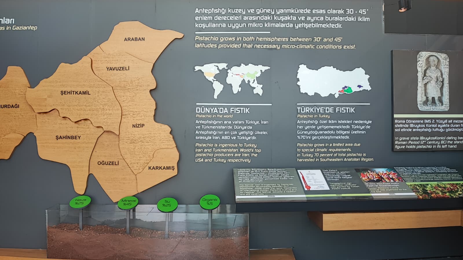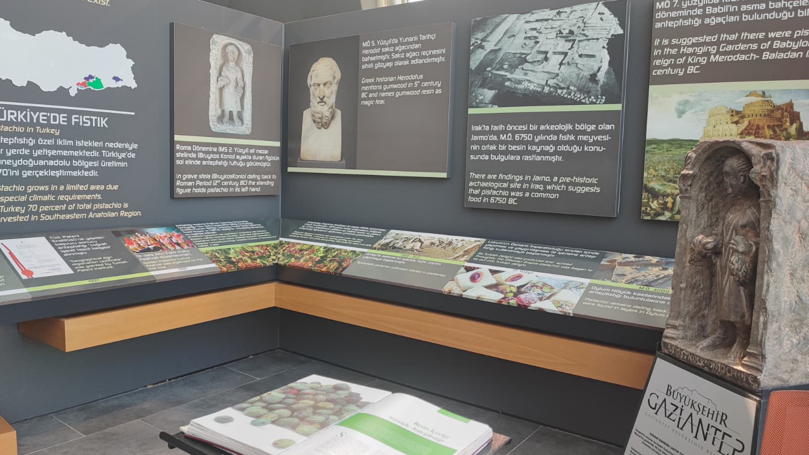Gaziantep Büyükşehir Belediyesi’nin girişimleri ile kentimize yeniden getirilen RomaniBambino heykelinin replikası vardır.Oylum Höyük, Jarmo Höyük, Heredot, Babilin Asma Bahçeleri, Osmanlı mutfağı ve Fıstık Araştırma Enstitüsü, hakkında bilgi vardır.Gaziantep’in kültürel etkinlikleri hakkında Görsel vardır.Yetiştiği bölgeler bölümünde;Dünya’da ve Türkiye’de fıstığın yetiştiği bölgeleri işaret eden üç adet harita vardır.