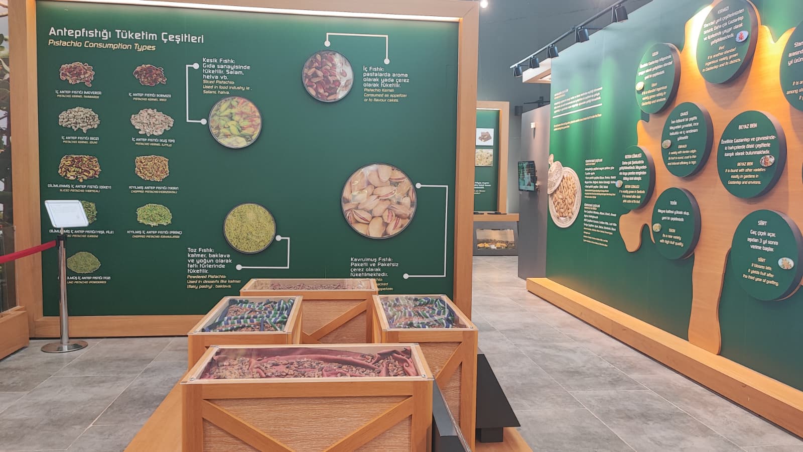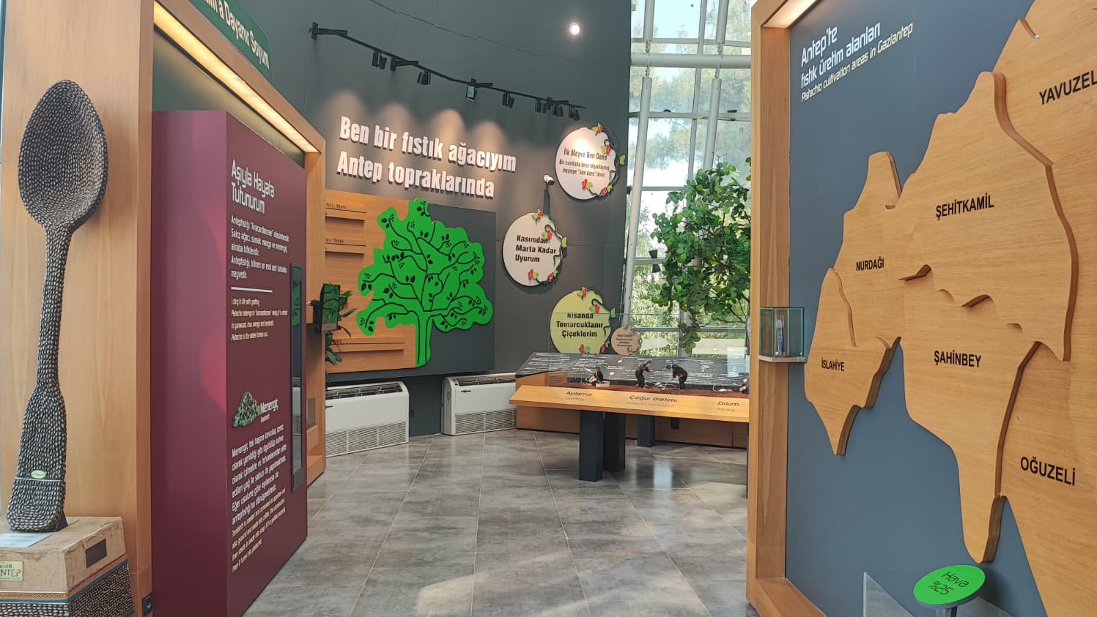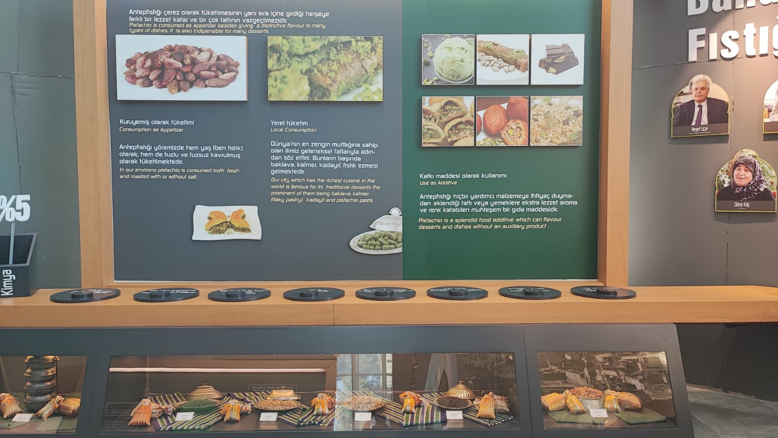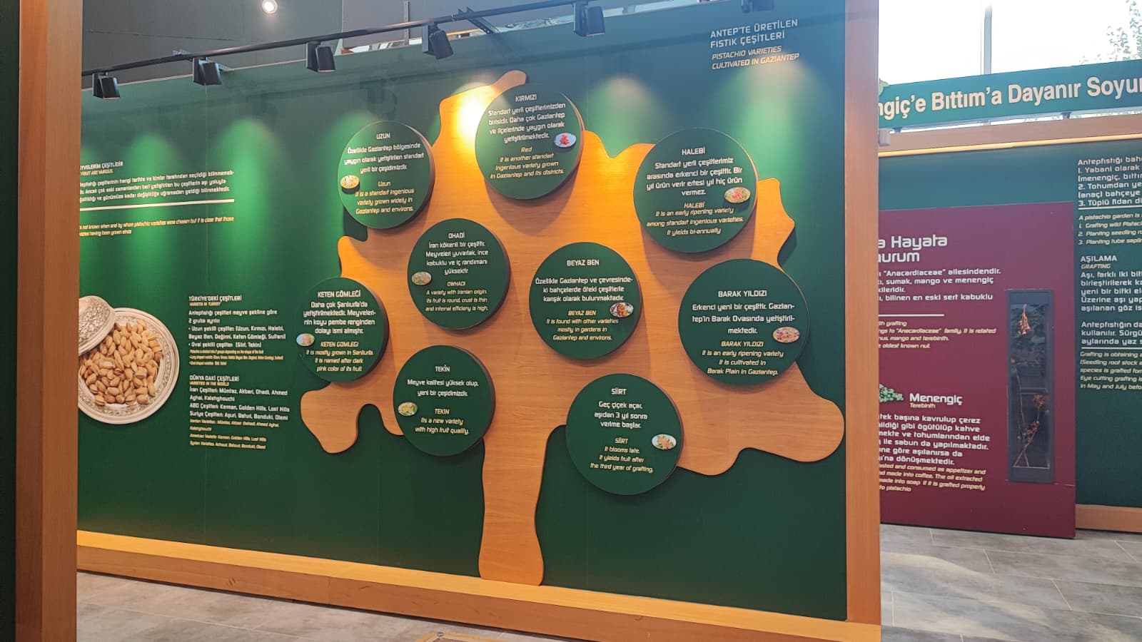 Gaziantep Büyükşehir Belediyesi’nin girişimleri ile kentimize yeniden getirilen RomaniBambino heykelinin replikası vardır.Oylum Höyük, Jarmo Höyük, Heredot, Babilin Asma Bahçeleri, Osmanlı mutfağı ve Fıstık Araştırma Enstitüsü, hakkında bilgi vardır.Gaziantep’in kültürel etkinlikleri hakkında Görsel vardır.Yetiştiği bölgeler bölümünde;Dünya’da ve Türkiye’de fıstığın yetiştiği bölgeleri işaret eden üç adet harita vardır.