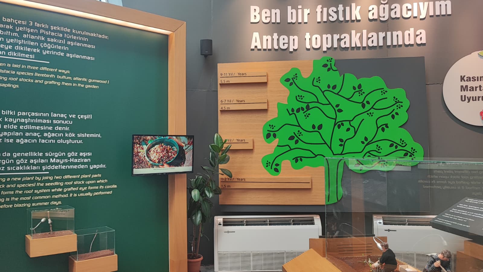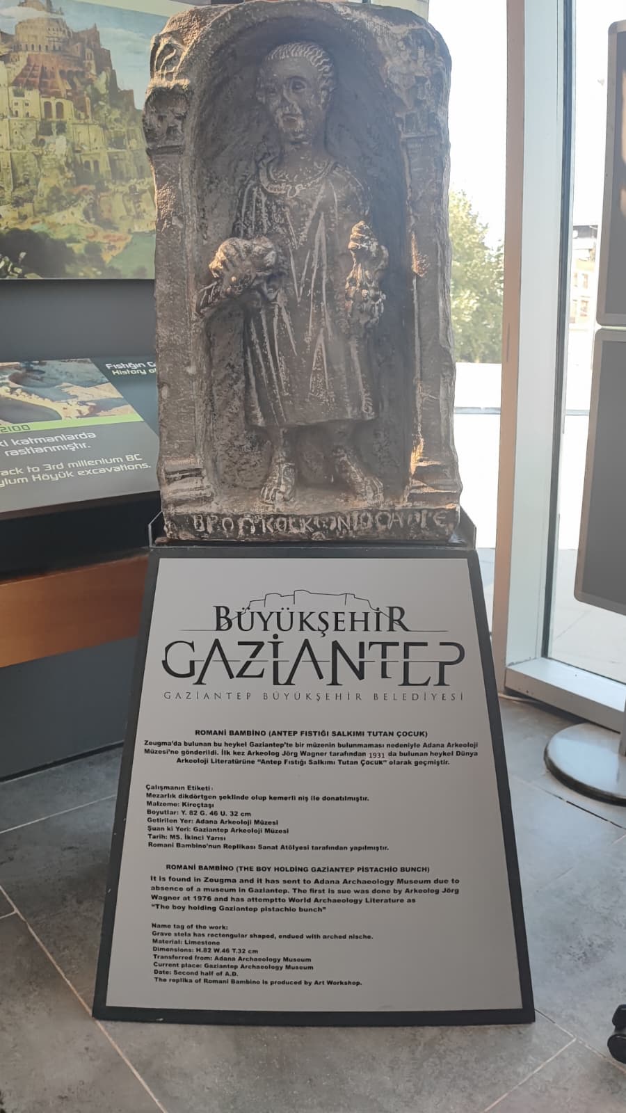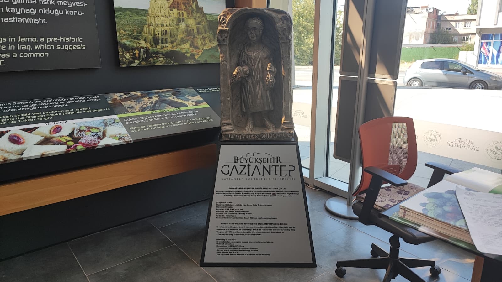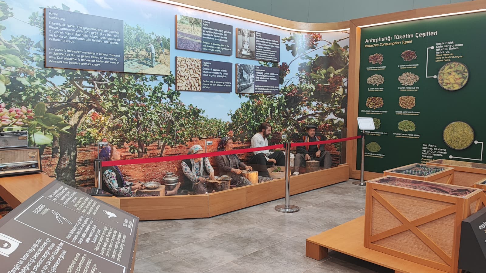 Gaziantep Büyükşehir Belediyesi’nin girişimleri ile kentimize yeniden getirilen RomaniBambino heykelinin replikası vardır.Oylum Höyük, Jarmo Höyük, Heredot, Babilin Asma Bahçeleri, Osmanlı mutfağı ve Fıstık Araştırma Enstitüsü, hakkında bilgi vardır.Gaziantep’in kültürel etkinlikleri hakkında Görsel vardır.Yetiştiği bölgeler bölümünde;Dünya’da ve Türkiye’de fıstığın yetiştiği bölgeleri işaret eden üç adet harita vardır.