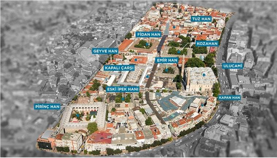 Erken Osmanlı döneminde yapılan 668 yıllık geçmişiyle Hanlar Bölgesi, Bursa'da çarşı yapısının nasıl oluştuğunu göstermesi açısından önemlidir. Bu bölgedeki hanlar; Koza Han, Fidan Han, Pirinç Han, İpek Han, Emir Han, Geyve Han, Galle Han, Çukur (Kütahya) Han, Kapan Han, Tuz Han'dır.