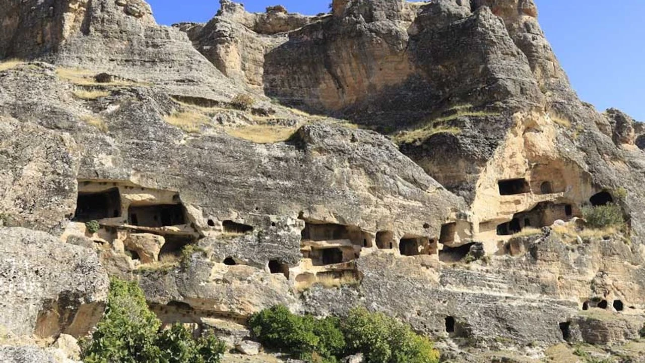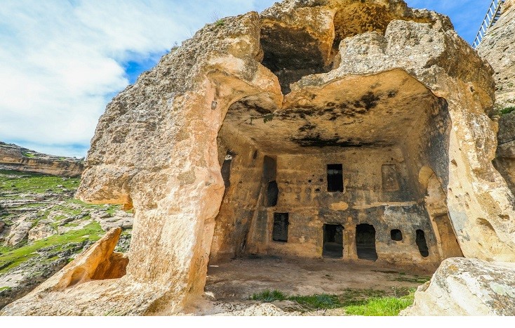 Yekpare kaya parçaları üzerine oyularak yapılmış irili ufaklı 300 odadan oluşan ve bir kaleyi andıran Hasuni Mağaraları, kapladığı alan ve mağara sayısı itibariyle Anadolu'da emsal teşkil etmektedir. Bir kaya kilisesi olmak üzere iki kiliseye sahip olan Hasuni Mağaraları, koridorlarla birbirine bağlıdır. Mağaralarda sarnıçlar, taştan oyma su depoları ve su kanalları yer almaktadır. Kaya şehrinin en zirve noktasında ise uzun bir taş merdivenle çıkılan ve adak yeri olarak kullanıldığı tahmin edilen küçük bir alan bulunmaktadır. Kayalara oyularak yapılan ve birkaç bölümden oluşan Hasuni Kaya Kilisesi, Anadolu'daki en eski mabedlerinden biridir. Tepesi huni şeklindeki 4 katlı kaya kilisesinin yanında eğitim amaçlı kullanıldığı düşünülen bölümün içinde mini bir amfiye benzeyen 5 basamaklı merdiven vardır.