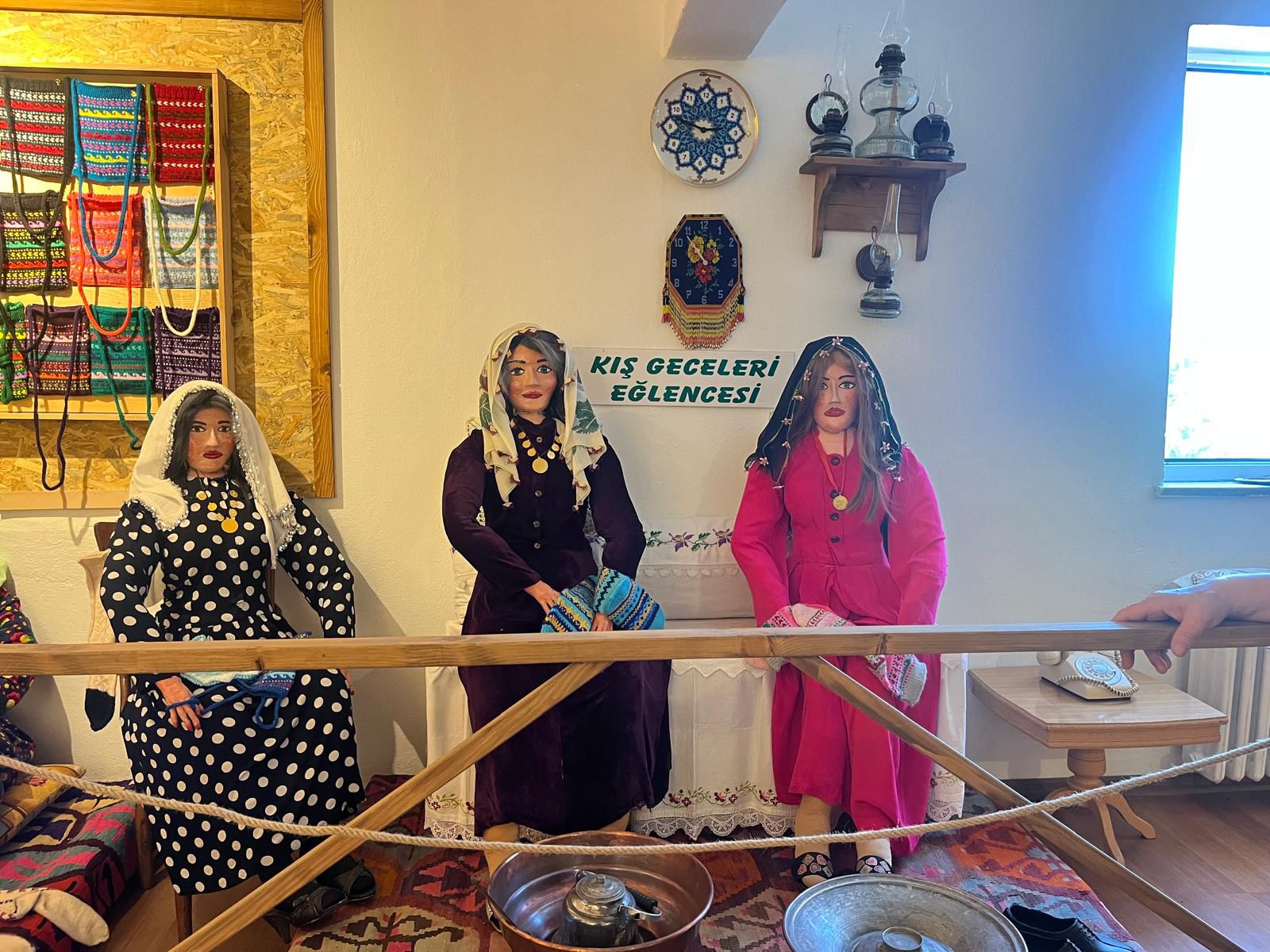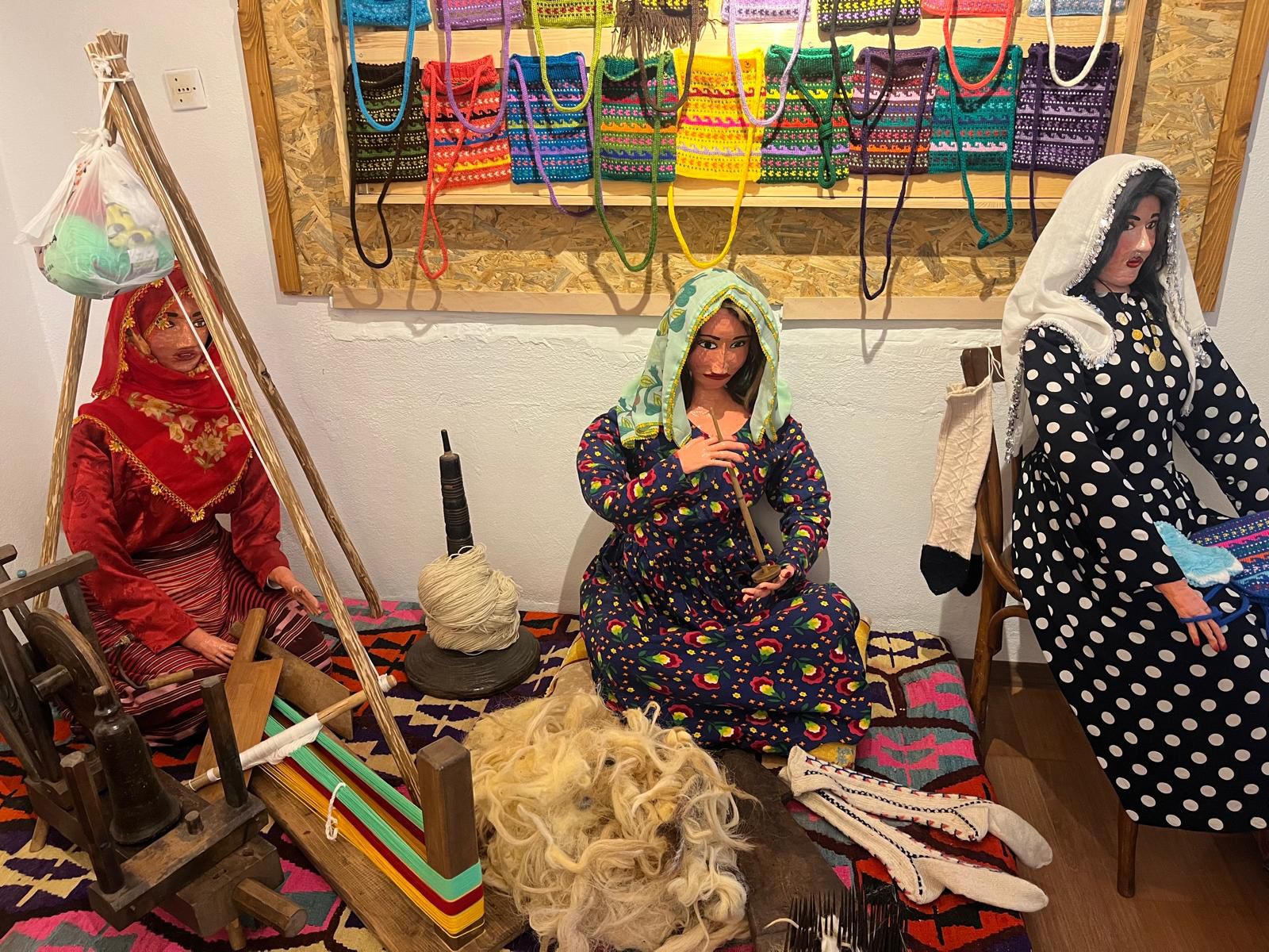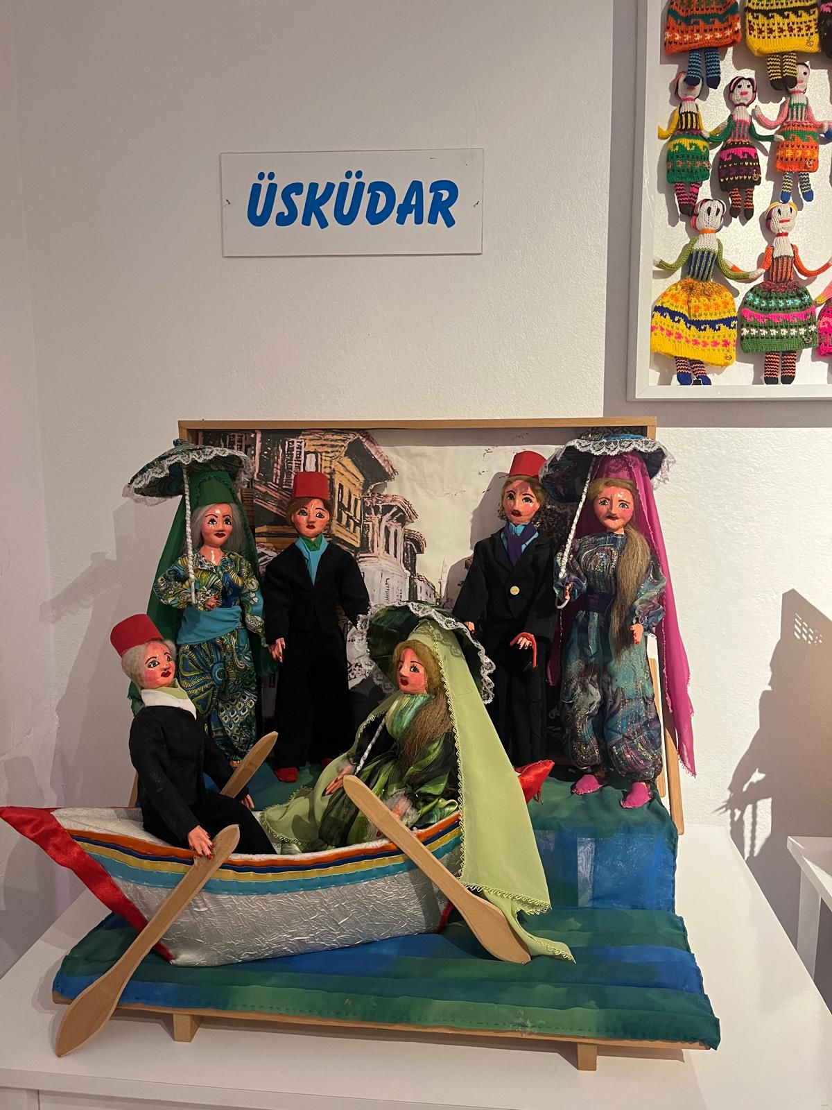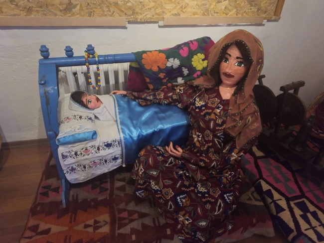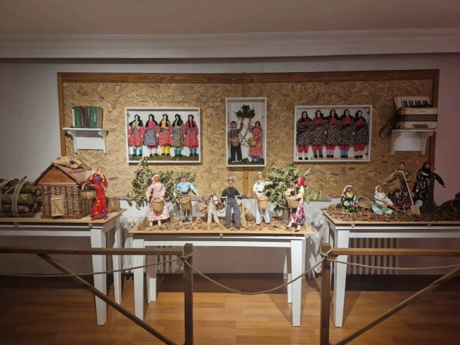 Geleneksel giysiler ve günlük yaşam sahneleriyle donatılmış kitre bebekler sergilenir,
