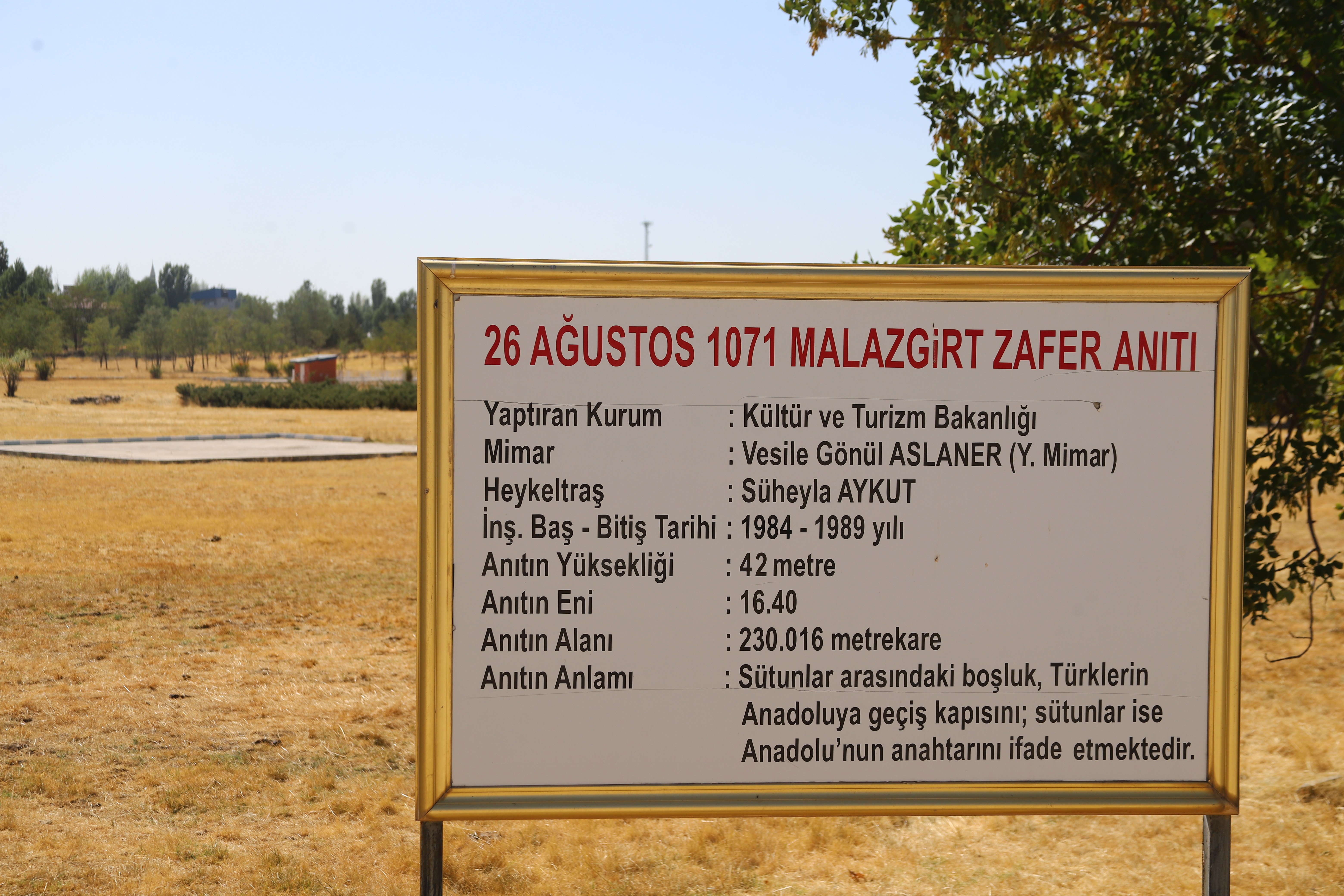 Malazgirt Zafer Anıtı, Kültür ve Turizm Bakanlığı tarafından Türklerin Anadolu’daki ilk büyük zaferi olan 1071 Malazgirt Zaferi anısına 1984-1989 yılları arasında Muş ‘un Malazgirt ilçesinde yaptırılmıştır. Eserin tasarımı Yüksek Mimar Vesile Gönül Aslaner’e ve Heykeltıraş Süheyla Aykut’a aittir. 42 metre uzunluğundaki iki sütunlu anıtta sütunların genişliği 16.40 metre, anıtın toplam alanı 230.016 metrekaredir. Anadolu’nun kapısını ve Türklerin Anadolu’ya girişini temsil eden anıtın sütunları arasındaki boşluk, Türklerin Anadolu’ya geçiş kapısını; sütunlar ise Anadolu’nun anahtarını ifade etmektedir
