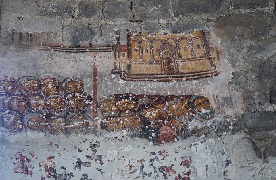 figürleri ile ünlüdür. Öşvank Kilisesi güney haç kolundaki giriş alnında bulunan kitabeye göre Gürcü Bağratlı Hanedanlığı zamanında III. Adernese'nin oğlu Magistras Bağrat tarafından 963-973 yılları arasında yapılmıştır. Mimarisi Öşklü Grigor'a ait olan kilise Vaftizci Yahya'ya adanmış yapının büyük kubbesi Bizans İmparatorları II. Basileios ve VII. Constantin tarafından 1022-1028 yılları arasında onarılmıştır. Kilisenin iç bölümlerinde bol miktarda görülen freskolar, 1036 yılında Jojil Potrikios tarafından yapılmıştır. Yapının iç bölümlerinde bulunan sütunların kaideleri bitkisel motifler ve dinî resimlerle bezenmiştir. Apsisin üstü yıkılmış olan kilisenin ön cephesinde, portakaldaki ilave bölüme ait sütunlardan birisi günümüze kadar gelememiş ve onun yerine bir ağaç kütüğü konulmuştur. Batı haç