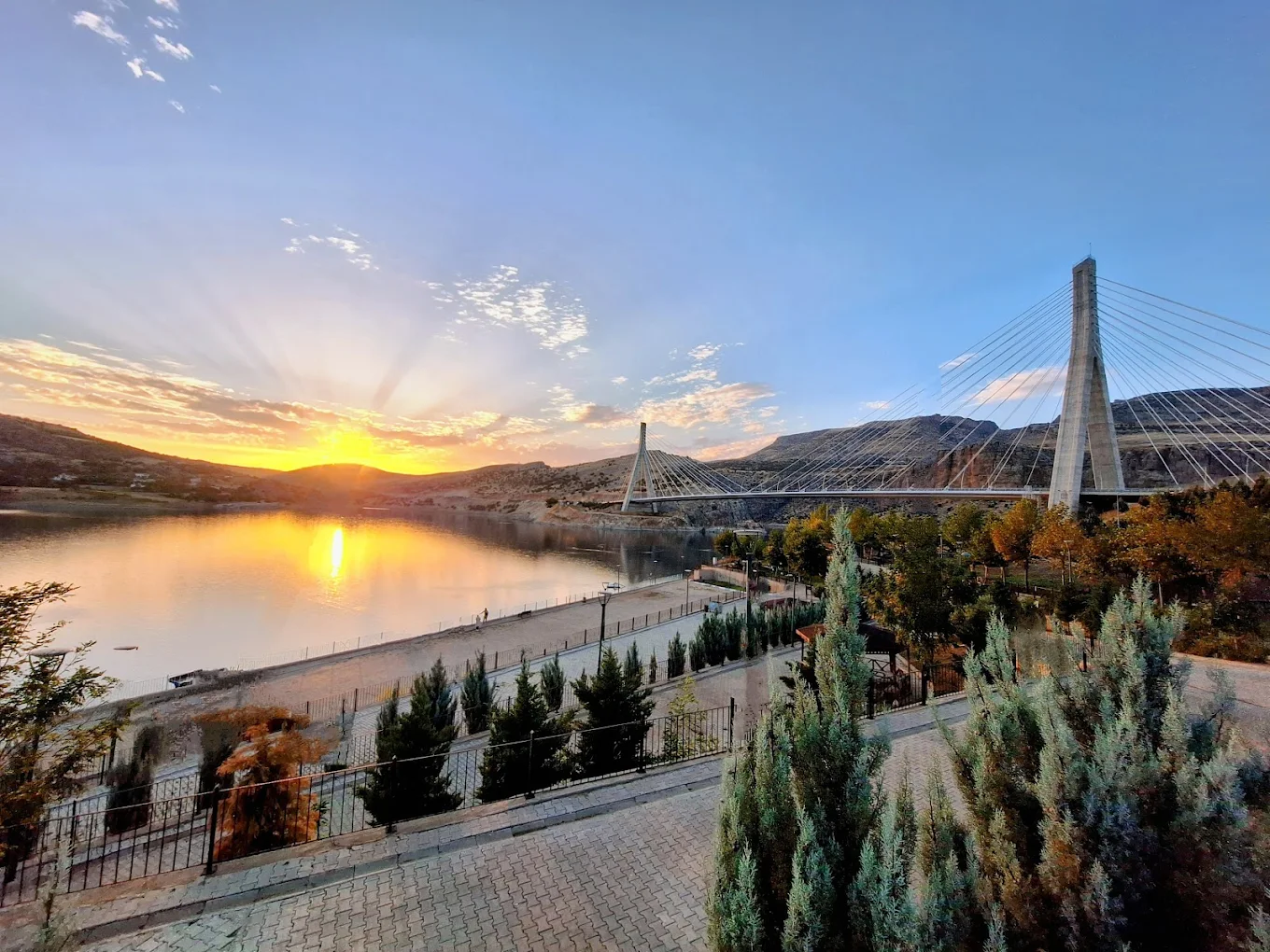 Şanlıurfa’nın Siverek ilçesinde yer alan Recep Tayyip Erdoğan Mesire Alanı, doğa ile iç içe vakit geçirmek isteyenler için eşsiz bir dinlenme noktası sunuyor. Türkiye’nin en büyük asma köprüleri arasında yer alan Nissibi Köprüsü’nün hemen yanında konumlanan bu mesire alanı, toplam 40.000 m²’lik geniş bir alana sahip. Alanda ziyaretçilerin keyifle vakit geçirebileceği piknik alanları, yürüyüş yolları, çocuk oyun alanları, oturma ve dinlenme bölümleri, seyir terasları ve yemyeşil doğa manzaraları bulunuyor. Ayrıca, ziyaretçilerin konforu düşünülerek 2 ayrı otopark, kapalı ve açık kafeteryalar ile mescid de projeye dahil edilmiş. Nissibi Köprüsü’nün büyüleyici manzarasına karşı sevdikleriyle vakit geçirmek isteyenler için Recep Tayyip Erdoğan Mesire Alanı, Siverek’in en güzel uğrak noktalarından biri olarak öne çıkıyor. Nissibi Köprüsü, Şanlıurfa’nın Siverek ilçesi ile Adıyaman’ı birbirine bağlayan, Fırat Nehri üzerinde yer alan görkemli bir mühendislik harikasıdır. Türkiye’nin en büyük asma köprüleri arasında yer alan bu köprü, yalnızca iki yakayı değil, aynı zamanda iki şehri de birbirine yakınlaştırarak bölgenin ulaşımını büyük ölçüde kolaylaştırmıştır. 610 metre uzunluğundaki Nissibi Köprüsü, modern mimarisi ve estetik görünümüyle dikkat çekerken, özellikle Fırat Nehri’nin muhteşem manzarasını izlemek isteyen ziyaretçiler için büyüleyici bir durak haline gelmiştir.