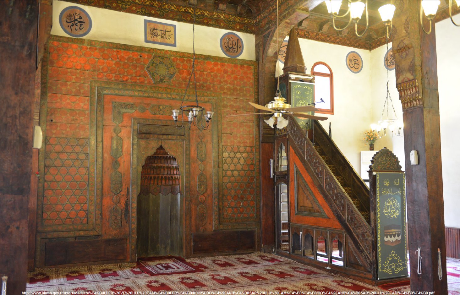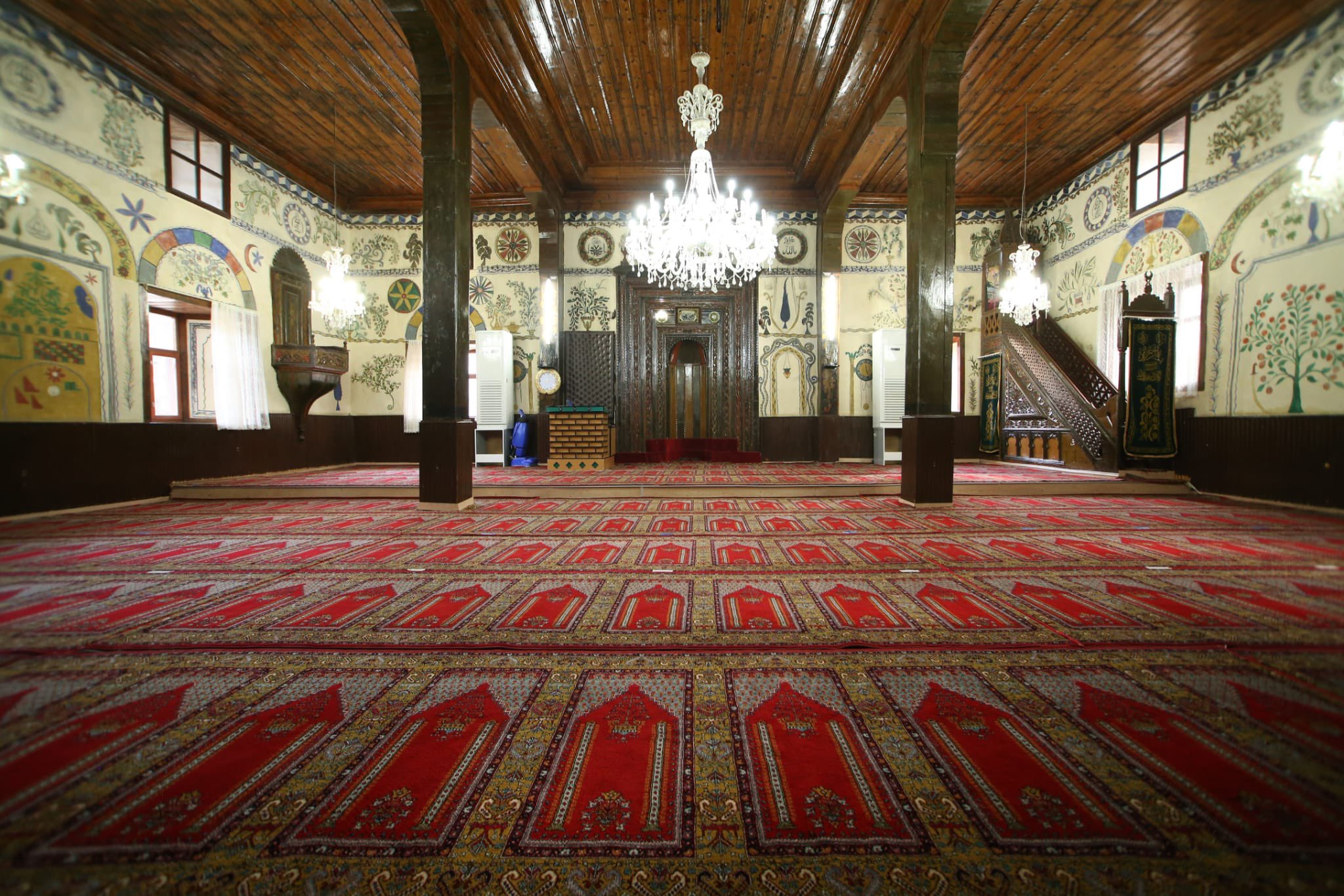 Güney duvarı ortasına oyulan yedi kenarlı nişin kavsarası üç mukarnas sırası ile doldurulmuş, etrafı da genişlikleri 12-85 cm arasında değişen altı sıra bordürle çerçevelenmiştir. Bazı bordürlerin sarı, kırmızı, siyah ve yeşil renkli altıgen, yıldız ve birbirine bağlanan oval madalyonlarla tezyin edildiği belli olmakta ancak büyük bölümünün süslemeleri yağlı boya altında kaldığı için ne olduğu tam olarak seçilememektedir. Bordürlerin döşeme altında kalan uzantıları ve detaylarından yola çıkılarak mihrap cephesinin geometrik ve bitkisel ağırlıklı bir kompozisyona sahip olduğunu söylemek mümkündür. Minber de mihrap gibi ahşaptan olup caminin batı duvarına bitişiktir.